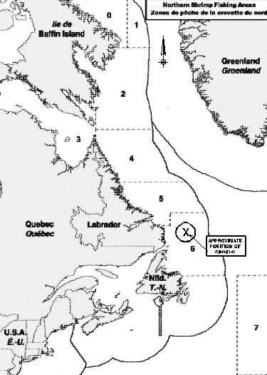 The "BCM ATLANTIC" was one of 13 large fishing vessels that held licences, issued under the Northern Shrimp (Integrated) Management Plan of the Department of Fisheries and Oceans (DFO), to fish Northern (or Pink) shrimp. Annual total allowable catches (TAC) are established for six shrimp fishing areas (SFA)Note de bas de page 2 for Canadian fishing vessels. These annual TAC are then divided into "Enterprise Allocations"Note de bas de page 3. The current fleet of 13 freezer trawlers fishes for 17 offshore northern shrimp licencesNote de bas de page 4. Most vessels involved are purpose-built for shrimp trawling and range in length from 42.6 m to 74.3 m, with hold capacities of from 400 m³ to 1960 m³. Fishing trips generally last until the hold is full, a period ranging from 25 to 75 days, depending on catch rates and hold capacity. These vessels make six to ten fishing trips per year, averaging a total of 200 to 320 days annually. The annual shrimp fishery opens at the start of the year and closes after the quota is taken (or runs through to December 31).