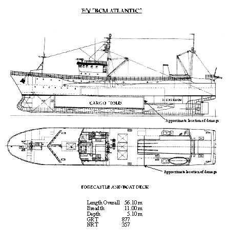 The "BCM ATLANTIC" was a single screw, conventional stern freezer trawler of all-steel, welded construction. The navigating bridge and crew accommodations were forward of midships. The vessel was subdivided into five compartments (below the main deck) by four transverse watertight bulkheads. The engine-room was located aft and shared a common bulkhead with the cargo hold.