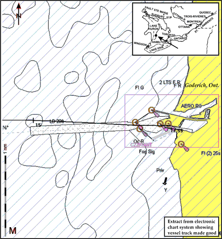 To assist inbound and outbound vessel traffic in Goderich Harbour, the navigational aid consists of a set of ranges which indicates an outbound course of 266.5° true. In the past, buoys were marking the limits of the channel but these were removed when the Government of Canada commercialized the operation of the port of Goderich and handed over its control to the municipality. The vessel was located south of the line of ranges after passing through the outer piers and was observed by the relief master to cross to the north of the range line a few minutes later.