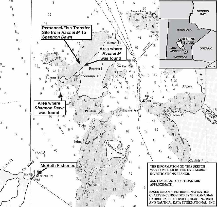 The swamped/capsized vessel Shannon Dawn was located approximately four nautical miles in a south-southwesterly direction from the transfer point. The PFDs recovered were found downwind, ashore on Berens Island near where the Rachel M was found. This suggests that, when the two fishers aboard the Rachel M transferred with the fish tubs over to the Shannon Dawn, they did not transfer the lifejackets/PFDs from one vessel to the other.
