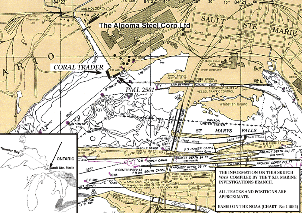 The harbour of Sault Ste. Marie, Ontario is located on the St. Marys River, which is the outlet of Lake Superior, connecting it with Lake Huron. The river is bounded to the north and east by the province of Ontario, and to the south and west by the state of Michigan, United States. The Algoma Steel Corporation wharf is at the north western side of the canal systems which by-pass the St. Marys Falls. The tanker Coral Trader and the barge PML 2501 were berthed at this wharf (see Figure 1).