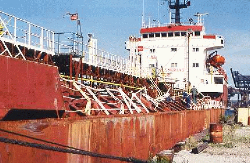 At approximately 2340, the Coral Trader's port side made contact with the port corner of the barge's bow. In continuing its astern manoeuvre while sideswiping the corner of the static barge, the Coral Trader suffered damage to its railings, manifold fittings and vents along the port side of the open deck (see Photo 3).
