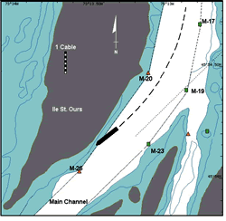 At the time of the blackout, the vessel was proceeding at 9.5 knots and on a starboard course alteration into Bellmouth curve (just southeast of Île Saint-Ours). The rudder, which was already to starboard due to the course alteration, caused the vessel to swing out of the channel and run aground in position 45° 54′ 10″N 073° 13′ 26″W (see Figure 3).