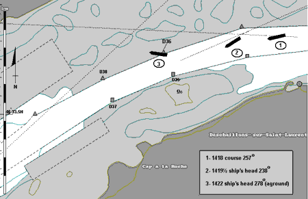 The pilot ordered hard to port, but there was still no response from the rudder. In very quick succession, both NFU joysticks were tried but neither gave any effect. The vessel was swinging to starboard and the current, setting at about 070°(T), had caught the port bow. At about this time, the master entered the bridge and was informed of the loss of steering. Full astern was ordered on the main engine and the crash stop sequence was initiated. Before astern power could be developed, the vessel exited the north side of the channel on a heading of approximately 285°. The Cedar was still making close to 9 knots and, as the bow came into contact with the channel bottom, the vessel's head shifted to port about 7° before coming quickly to a stop at 1422. The vessel was now aground at position 46°33'48" N; 072°07'33" W on a heading of 278°(position 3, Figure 1), the helm hard to port, but the rudder still to starboard about 4°.