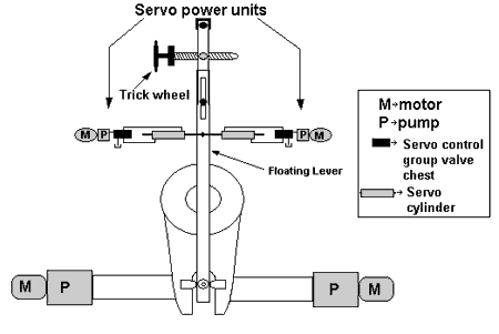 Trick wheel operation is necessary in the event of servo power failure. Incorrect installation of the servo power unit bypass valves on the Cedar meant that even when the servo pumps were off (or not functional), the associated servo cylinders were still hydraulically locked instead of in the bypass condition. In order for the trick wheel to operate the floating lever under these conditions, it would now require the extra step of decoupling both servo cylinders from the floating lever.