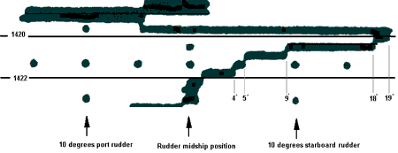 The vessel is equipped with a course and rudder angle recorder that gives a printout of courses steered and rudder angle achieved on a common time scale. Other data available from different sources on board include engine telegraph orders and an alarm log - both automatically monitored and each recorded on its own paper printout.