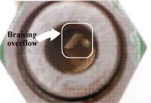 When installed at the shipyard, the connecting piping of the servo power units was copper. The piping connections were installed using direct braising methods and simple butt joints (Photo 3). Joints contained much excess braising material on the exterior, and the one examined in detail during the course of the investigation showed an overflow of braising material into the internal bore (Photo 4). It is estimated that the obstruction would restrict flow to about 70% of the design rate.Footnote 8 Bends in the piping were unsymmetrical and flattened at points to the extent that, during repairs subsequent to the grounding, TCMS required all servo power unit piping be replaced with steel piping, properly bent, fitted, and sized.