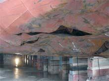 The forepeak and No. 1 starboard double bottom ballast tanks were punctured between frames 216 and 235 (approximately 12 m in length) running from the keel plate to the starboard bilge. The shell plating in way of damage was set in approximately 600 mm. The duct keel plate in way of frames 175 to 185 was also set in. Other bottom plates were set in as far astern as frame 151 and affected tanks 1 P, 2 P&S, 4 P&S, 5 P&S, and 7 S.