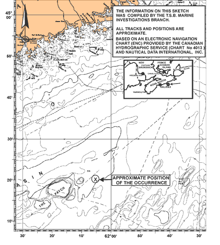 The Thebaud Sea departed the Mobil dock at Dartmouth, Nova Scotia for the Sable gas fields on 02 February 2001 at 2010.Footnote 2 Until the time of the occurrence, the voyage was uneventful. Winds were from the northeast at 20 knots, 1 to 1.5 m seas and an air temperature of 0° Celsius (C). Shortly before 0400, the third engineer, after completing rounds of the port and starboard engine rooms, proceeded to the mess for a coffee. At 0400, a machinery alarm system sounded and the third engineer proceeded towards the control room to determine the cause of the alarm. When he opened the starboard engine room door, he saw flames emanating through the open steel grating at the mezzanine level. He immediately closed the door, proceeded back to the change room and activated the fire alarm. He telephoned the wheelhouse and informed the second officer of the fire. The second officer activated the general alarm and broadcast "fire in the engine room" on the internal communications system. Meanwhile, the third engineer apprised the chief engineer and the second engineer (who were resting in their cabins) of the situation while the crew mustered at their fire stations.