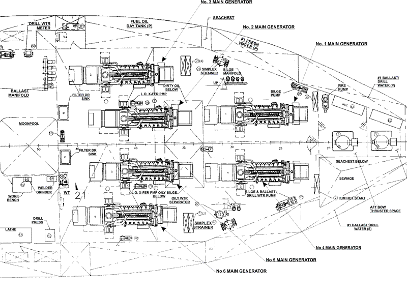 Fire damage to the forward section of the starboard engine room and mezzanine level was extensive. Most of the electrical cables were either heavily damaged or destroyed. The steel deck grating directly above the No. 4 main generator was noticeably distorted. Fire damaged the paint work on the mezzanine level directly above the No. 4 main generator. Heat from the fire caused the paint on the bulkhead separating the port and starboard mezzanines to blacken and blister in the port engine room.