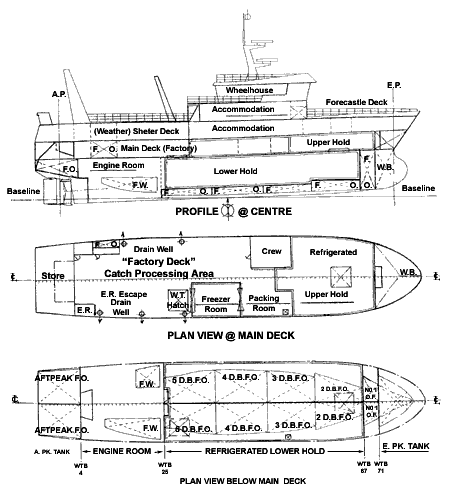 The location of the engine room, decks, watertight hatches, oil fuel, water ballast, and freshwater tanks, refrigerated upper and lower holds, shrimp-processing areas, and crew accommodation, etc. were as shown in the Outline General Arrangement (see Figure 1).