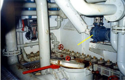 A short time later, two engineers wearing SCBA entered the engine room and conducted a more extensive inspection of the upper landing area. When they exited the space, they reported that there was no indication of fire but that they felt very cold and that their skin had a burning sensation. After this visit, the two engineers returned to the engine room to check out the lower levels where they discovered that, while there was no sign of fire, the standby (starboard) liquid refrigerant pump was totally destroyed. As a precautionary measure, they closed all the sea suction valves when in the engine room.