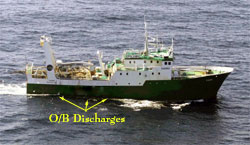 In routine operations, catch waste material and washing water from the shrimp catching and processing operations gravitated to the drain wells located on each side of the factory deck and was discharged overboard by the automatic, electrically driven submersible pumps.