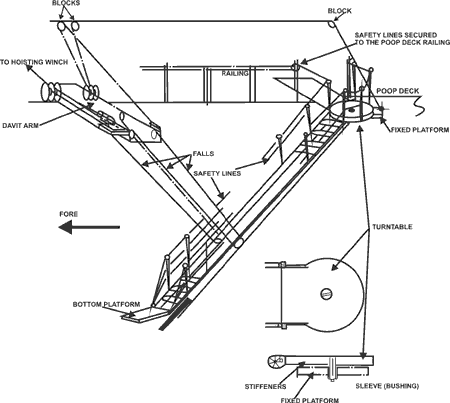 The falls are reeved through sets of sheaves that are fixed to a davit arm, one end of which is hinged to the deck. Through another system of sheaves and snatch blocks mounted on various deck and side posts, the falls are wound around the drums of an electric winch. To hold the .winch, and thence the ladder, in its last set position, the electric motor has an electromagnetic disc brake. A second manual band brake, intended for emergency use in case the main brake fails, is also fitted around one of the winch drums.