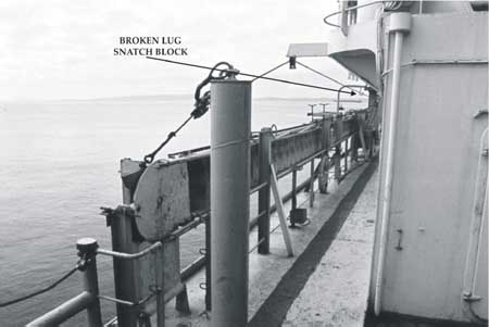 - The pad eye securing the snatch block-through which the falls were reeved-parted and released the snatch block. The snatch block then violently hit in the forehead a crew member, who succumbed to his injuries.