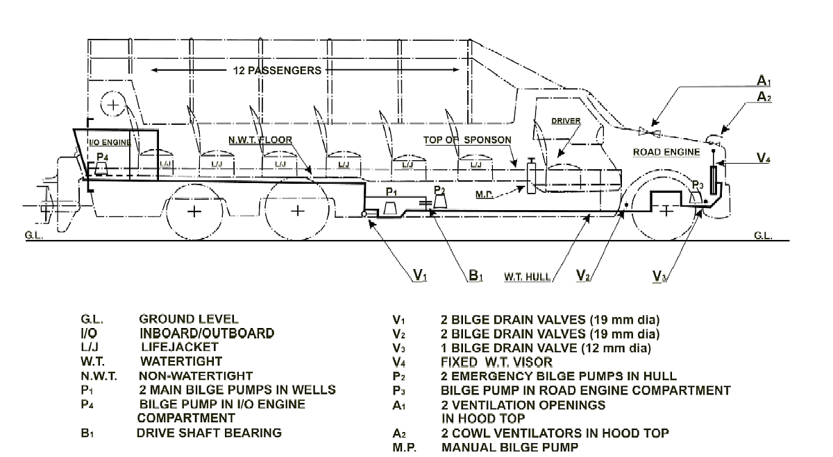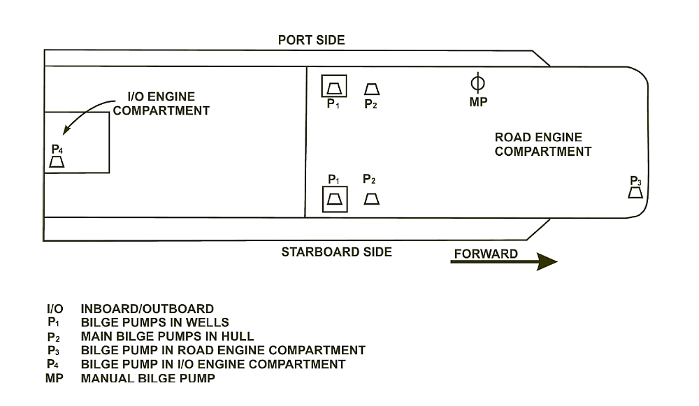 A submersible bilge pump of 1100 US gal/h (69.4 L/min ) maximum rated capacity, incorporating an automatic float switch, was located at the forward end of the forward engine compartment. Another submersible bilge pump of 630 US gal/h (39.7 L/min) maximum rated capacity, also with an automatic float switch, was located in the Mercruiser I/O engine compartment at the after end of the vehicle.