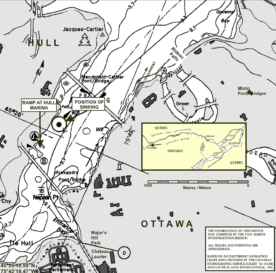At about 1610 on 23 June 2002, the amphibious vehicle Lady Duck took on water while on the Ottawa River during a combined land and water-borne sightseeing tour of the National Capital Region. The vehicle sank rapidly by the bow in eight metres of water when near the Hull Marina. Of the 12 people on board, 6 passengers, the driver, and the tour guide escaped from the vehicle and were recovered by private craft on the scene at the time of the sinking. Four passengers, trapped within the sinking vehicle, drowned. There was no environmental damage.