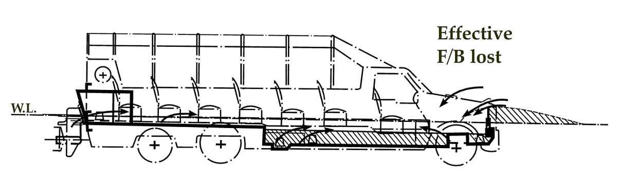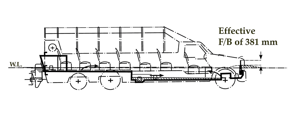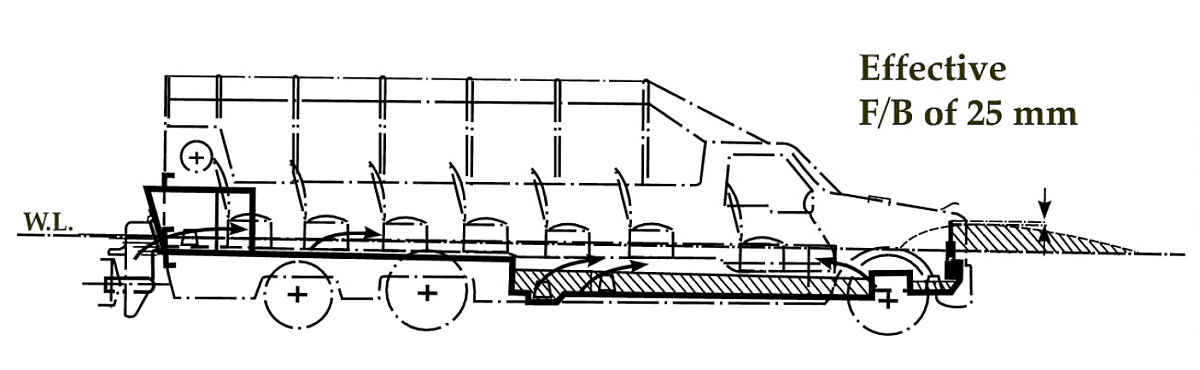 The bottom of the chassis was enclosed with welded and bolted steel plating and the sides were extended upward to enclose a buoyant structure. The original truck wheels and suspension were fitted outside the watertight hull. The effective breadth of the chassis was increased by the addition of extensions (sponsons) on each side. These sponsons were partially filled with rigid foam plastic to enhance transverse stability and buoyancy and to ensure appropriate forward and after trim when water-borne.