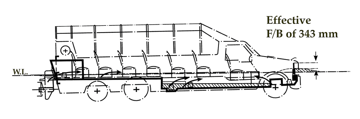 A passenger boarding ramp, located at the rear left corner of the vehicle, hinged up to a steel sill and a flexible gasket to ensure the watertight boundary of the passenger deck. The ramp was lifted to the closed position by an electrically driven winch and secured in place with hasps on each side of the ramp.
