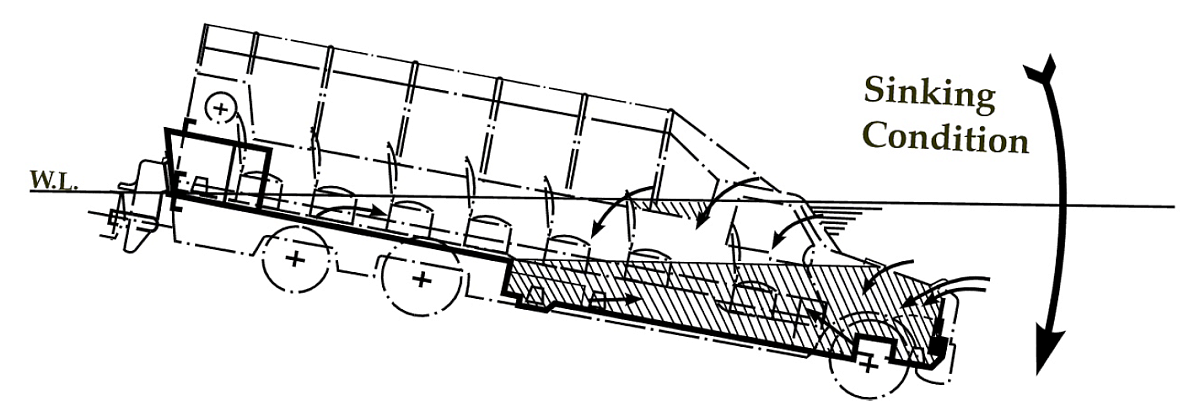 When the vehicle entered the water, the main bilge pumps were switched on to clear the hull of any shipped water. Because no water was seen to be discharging from the outlets near midships, the emergency bilge pumps were also activated to discharge the accumulation of floodwater. Water was then seen discharging intermittently from outlets on both sides of the vehicle near midships.