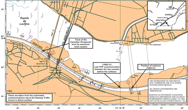 Around 1827, the Canadian Prospector was entering the South Shore Canal while the Stellanova reduced speed to about two knots on approaching the Côte-Sainte-Catherine dock due to a containment boom deployed around the Algosound. At 1842, the Canadian Prospector broadcast a courtesy call to advise traffic that it was off Church Point, and at 1855, when the vessel passed under the Honoré-Mercier Bridge, its speed was 6.9 knots and its heading 122° (T).