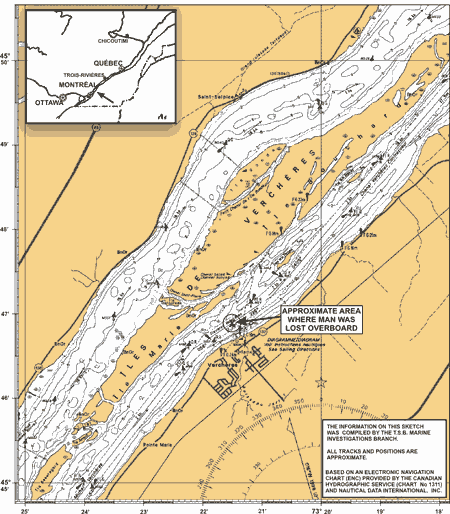 Soon after the pilot had broadcast a PAN PAN PAN message, a yacht came out of Verchères marina and began searching the area. The crew was mustered to the boat stations and the port lifeboat was prepared, but not lowered to the water as the vessel had too much way on to launch the boat safely. As the Kent proceeded down river, reducing speed, the Canadian Coast Guard vessel CG 1204 passed upbound, having joined the search. A military helicopter was also on the scene within approximately one hour of the bosun falling overboard.