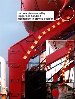 With a lifeboat on its roller gravity davits in the stowed position, the trigger line release handles are in line with the davit cradles (see Photo 2). In this "locked" position, the harbour pins are secured across the roller track to prevent the descent of the gravity davits holding the lifeboat. In the released position, the trigger line release handles are pulled down to the vertical, simultaneously releasing the trigger line and allowing the harbour pin to be swept aside as the gravity davits, with the suspended lifeboat, descend the davit cradle roller tracks (see inset in Photo 2).