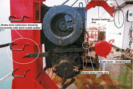 - The outboard end of the brake lever (opposite the weighted end) was extended such that the handle was near the vessel's side to control, within view, the lowering of the lifeboat down the ship's side to the waterline. The handle was in very close proximity to (6 cm below and 5 cm out from) the second rung of the aft cradle ladder (see Photo 3). It was further noted that if this handle was pushed down, it would have the same effect as lifting the brake lever at the inboard (weighted) end, that is, to disengage the brake.