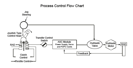 In this mode, the automatic steering control unit is bypassed and the hydraulic valve is directly controlled by the 'Jog' steering switch (see Figure 1). Each RAD leg has its own jog switch and the switch itself has three positions - the centre position being 'zero' or neutral, while the two positions at either side of the centre rotate the RAD either clockwise or counterclockwise. This rotation is sustained as long as the switch is held in position. The switch is spring loaded to return to its centre, 'neutral' position upon release. This effectively stops further rotation of the RAD.