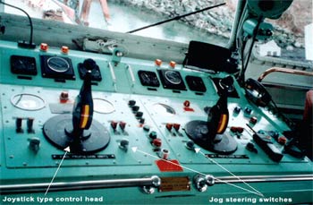 Each wheelhouse control console overlooks its half of the vehicle deck and by means of a 'transfer' switch, becomes the active or 'live' control station. There are two 'joystick' type control heads at each console and one pair of 'end' RADs is controlled by each joystick (see Photo 3). The vessel being double-ended, either console can be used for manoeuvring.