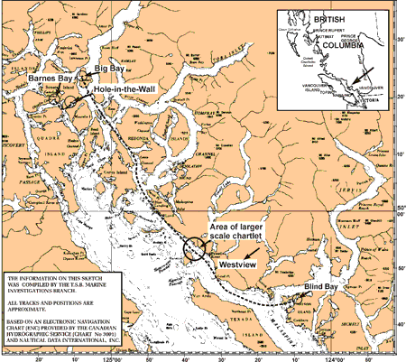 At 1930, the Bruce Brown overtook the southbound tug Regent off Hurtado Point, 11 miles northwest of Westview. The master of the Regent last noticed the Bruce Brown at approximately 2315, just beyond Atrevida Reef, close to shore.