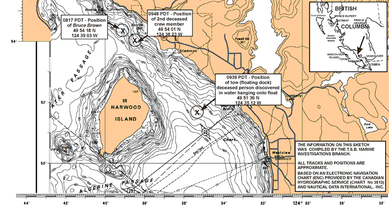 At Barnes Bay they took in tow a wooden floating dock, measuring 37 m x 3.1 m, supported by foam flotation. This was secured with a 20 mm polypropylene tow line, 42 m in length. The free end of the tow line was formed into a spliced eye, which was placed over the towing post on the Bruce Brown. The deck of this dock was 45 cm above the water and the dock was not fitted with a boarding ladder. There was no means of access to the deck of the float for a person in the water. The Bruce Brown and tow departed Barnes Bay and headed toward Blind Bay, 60 miles to the southeast. Their routing took them again through Hole-in-the-Wall passage. Twenty miles into their southward passage, off Teakerne Arm, the Bruce Brown met a northbound boat operated by a friend. Both vessels stopped for a few minutes to chat. The time was approximately 1600.