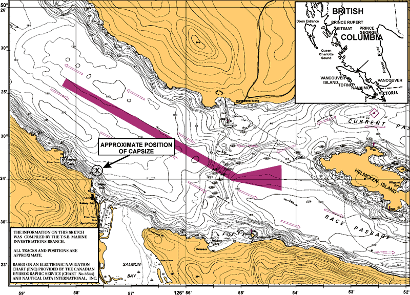 The capsizing occurred in an area to the west of both Current Passage and Race Passage, where the weaker current would have had a less effect on the vessel's behaviour. Tide rips, dangerous to small craft, are encountered in the vicinity of Kelsey Bay and had a major effect on the vessel.