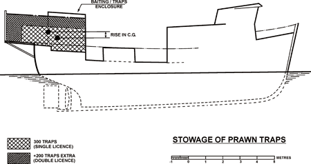 Within the fleet of approximately 250 licensed prawn-fishing vessels, about 35 of which received RTL licences, the remainder used 300 traps each. Smaller vessels carrying the traps on deck incur some measure of risk by reducing vessel stability. The risk increases significantly when an RTL licence is granted to the smaller class of vessel, which has limited deck space and is more susceptible to capsizing when carrying 500 traps at a greater height on deck.