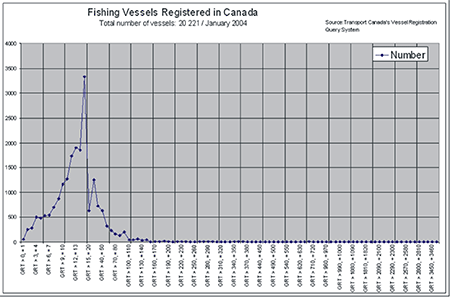 - 3336 fishing vessels have a gross tonnage greater than 14 but not over 15; this group represents 15 per cent of the Canadian fleet.