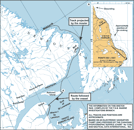 Since the master preferred to sail by day, the first stopover was made on the evening of 26 September at Anse-à-Beaufils on the Gaspé Peninsula. The next morning, without having prepared a voyage plan, the boat headed for Anticosti Island. Late that evening, the crew dropped anchor a few hundred metres from the shore in Goélands Bay, located approximately 1.5 nautical miles northwest of Pointe de l'Est.