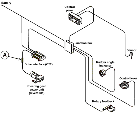 During the installation, a 20 A fuse was added between the drive interface and the power unit (see "A" in Figure 2). Experience showed that the power unit of the steering gear tended to fail at sea. The fuse was added to limit maintenance and the need to replace this part.