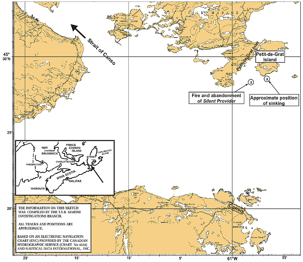 On 05 July 2003, the fishing vessel Silent Provider left Canso,Footnote 3 Nova Scotia, at approximately 1700 Atlantic daylight timeFootnote 4 and made way for Petit-de-Grat to undergo an underwater hull inspection by Transport Canada (TC).