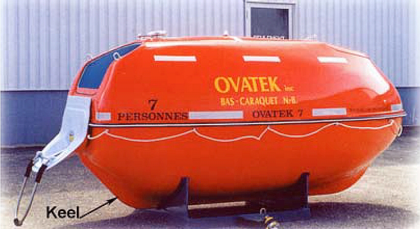 The Ovatek liferafts are constructed with a double-layered fibreglass shell filled with approximately 38 mm of polyurethane foam, which provides inherent flotation and insulation. They are fitted with two hatches, one aft with an integrated ladder for boarding and one forward. The upper shell is fitted with air vents that can be screwed closed, and a becketed line is attached around the outside diameter. The Ovatek 4 is 2.06 m in length, weighing 115 kg and the Ovatek 7 is 2.83 m in length, weighing 182 kg. The centre of gravity is such that the Ovatek, even with the ballast retention devices empty, will self-right if the hatches are closed and there is no water within.