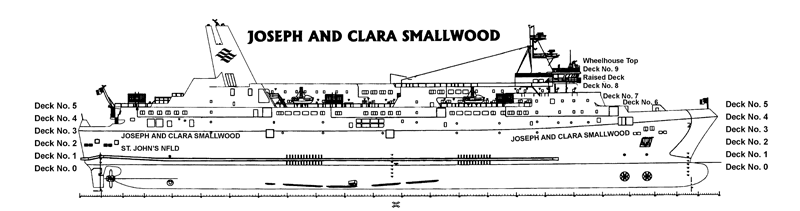 The Joseph and Clara Smallwood was built in 1989 as a roll-on/roll-off (ro-ro) ferry to transport passengers and vehicular traffic between Nova Scotia and Newfoundland. The vessel has two vehicle cargo areas on decks 1 and 3, and passenger facilities on decks 3 through 7 (for outboard profile, see Appendix B). The vessel has the capacity to carry up to 1353 passengers, 370 automobiles or 77 tractor-trailers and may have a crew of up to 87. The Joseph and Clara Smallwood and its sister ship, the Caribou, are the two largest passenger ferries presently operating in Canada.