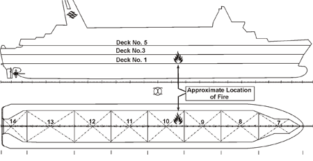 On being informed of the fire, the SCO immediately located the master and apprised him of the situation. The time was approximately 2316. The master instructed the SCO to proceed to the vehicle deck to investigate the fire and report back. The senior chief engineer, on his way to the MCR, opened an access door to vehicle deck 1 (see Figure 1) but was unable to see anything due to the thick smoke. After ensuring that the door to the vehicle deck was closed, he proceeded to the MCR.