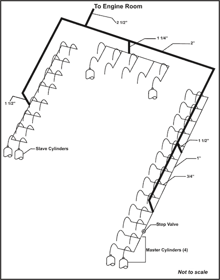 The arrangement of CO2 cylinders was comprised of four master cylinders and 49 slave cylinders, each containing about 45 kg of liquid CO2 at a pressure of 6300 kPa (at 24°C). Two of the master cylinders were fitted with manually operated valves, which could be opened from either within the CO2 compartment or from remote CO2 release stations (see Appendix B).