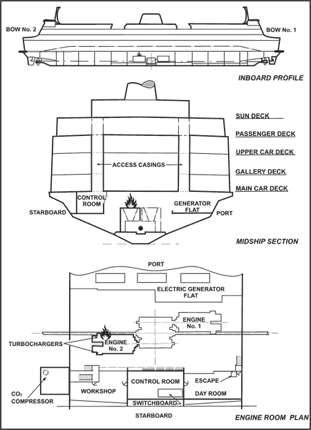 The Queen of Surrey is a double-ended vessel, having a wheelhouse, propeller and rudder at each end, with the engine room being at midships. The two ends are almost identical and, for the purposes of identification, are numbered "1" and "2." This establishes the port and starboard sides of the vessel and the numbering system of the machinery in the engine room (see Figure 1).