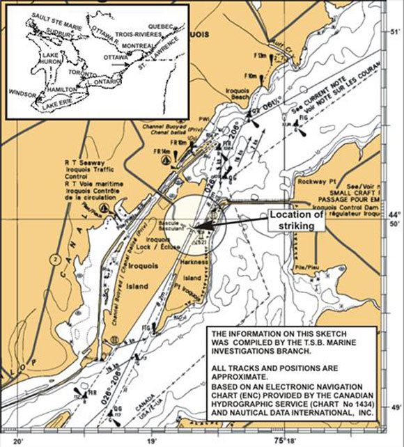 On 15 August 2004 at 1525 eastern daylight time, while exiting Iroquois Lock in the St. Lawrence Seaway, the bulk carrier Federal Maas struck Bridge 12 at the lower end of the lock. The vessel sustained damage to its port bridge wing. Damage to Bridge 12, which was not fully raised, was minimal and the lock was closed to traffic for approximately four hours.
