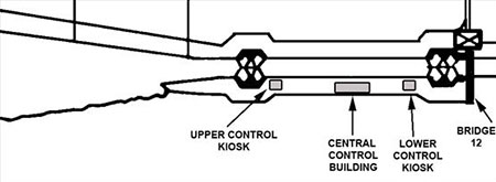 The central control station at the centre of the lock provides the operator a clear view of the upper and lower ends of the lock, as well as computer displays of the machinery status and CCTV displays from various camera locations in the lock area. Similar computer and CCTV displays are located at the upper and lower kiosks; however, the placement of the CCTV cameras provided a less-than-optimum view of the entire lock. Additionally, the bridge is not visible from the upper control kiosk and the view from the lower kiosk is such that the difference between 92 per cent and 100 per cent open is not readily discernable. Viewed down the lock from the central control location, the difference in elevation angle is more evident.