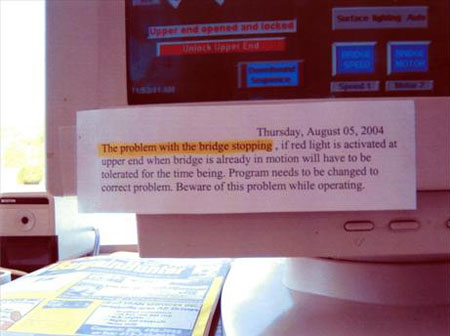 Following this modification, another problem was noted by the staff at Iroquois Lock. In order to operate the upper end, the red light must be on. However, when the upper navigation lights are switched from green to red while the bridge is in motion, the bridge immediately stops, regardless of its position. This deficiency was noted by SLSMC staff and, on 05 August 2004, all operating shifts were informed verbally and a warning note was posted on the computer control stations (see Photo 3); however, no formal information concerning the problem or modified procedures was passed on to the affected operating staff.