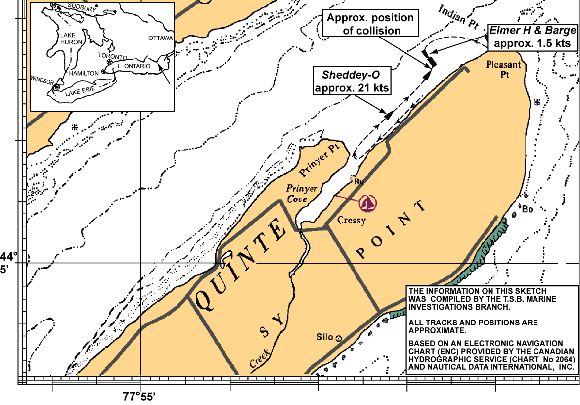 The operator of the Sheddey-O attempted to alter course to starboard at the last moment, but at 2125, the vessel's bow struck the starboard side of the barge at an approximate 90-degree angle, in position 44° 06′ 47″ N latitude, 076° 51′ 12″ W longitude (see Figure 1). The three people on the Sheddey-O's forward deck were thrown forward by the impact; two of them landed on the barge and the third person bounced off the barge and over its port side. This person's personal flotation device then became snagged on the underside of the slow-moving barge, whereupon the operator of the Elmer H stopped the engines and dove into the water to perform a rescue.