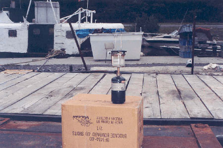 At the time of the collision, these lights were not fitted on board the barge. To light the deck, a propane lamp typically used for camping was placed on top of a 0.3 m-high cardboard box some 2.5 m aft of the bow. Luminosity tests revealed that this light could be seen to a maximum distance of 0.9 to 1.1 nautical miles.Footnote 4