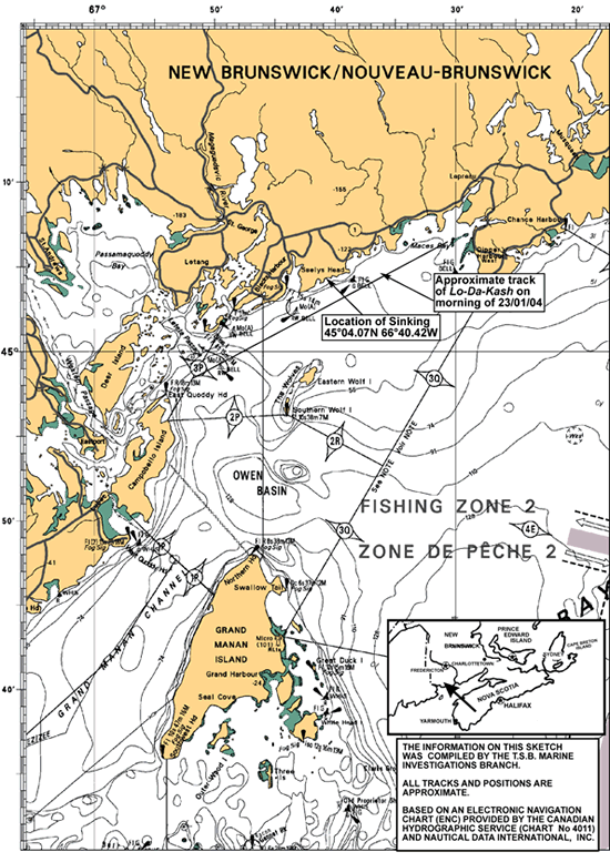 On the morning of 23 January 2004, the small fishing vessel Lo-Da-Kash departed Maces Bay, New Brunswick, on a trip of 21 nautical miles to Campobello Island, New Brunswick, to pick up fishing gear. When the vessel was about halfway back to Maces Bay on the return trip, it sank with four persons on board (two crew members and two guests). One person swam a short distance to shore, but subsequently succumbed to hypothermia. Two people drowned, and one person remains missing and is presumed drowned.