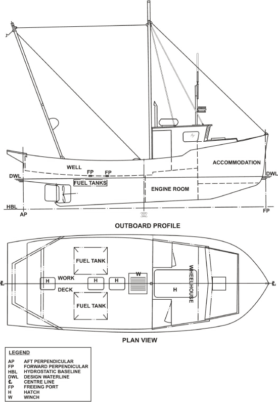 A lines plan and an outline general arrangement (see Figure 1) of the Lo-Da-Kash were prepared. The inclining experiment report was produced. All facts and data pertaining to the stability of the vessel were gathered. Using the lines plan, a computerized model of the vessel was prepared, including two fuel oil tanks and the after well together with the freeing ports. Hydrostatic and cross curves were produced, together with the lightship characteristics of the vessel, using the data available from the inclining experiment report. Aspects of the Lo-Da-Kash's stability were compared against the stability standardsFootnote 3 for small fishing vessels. Although the vessel was not required to comply with the stability standards, these standards provide a yardstick against which a vessel's stability can be assessed.